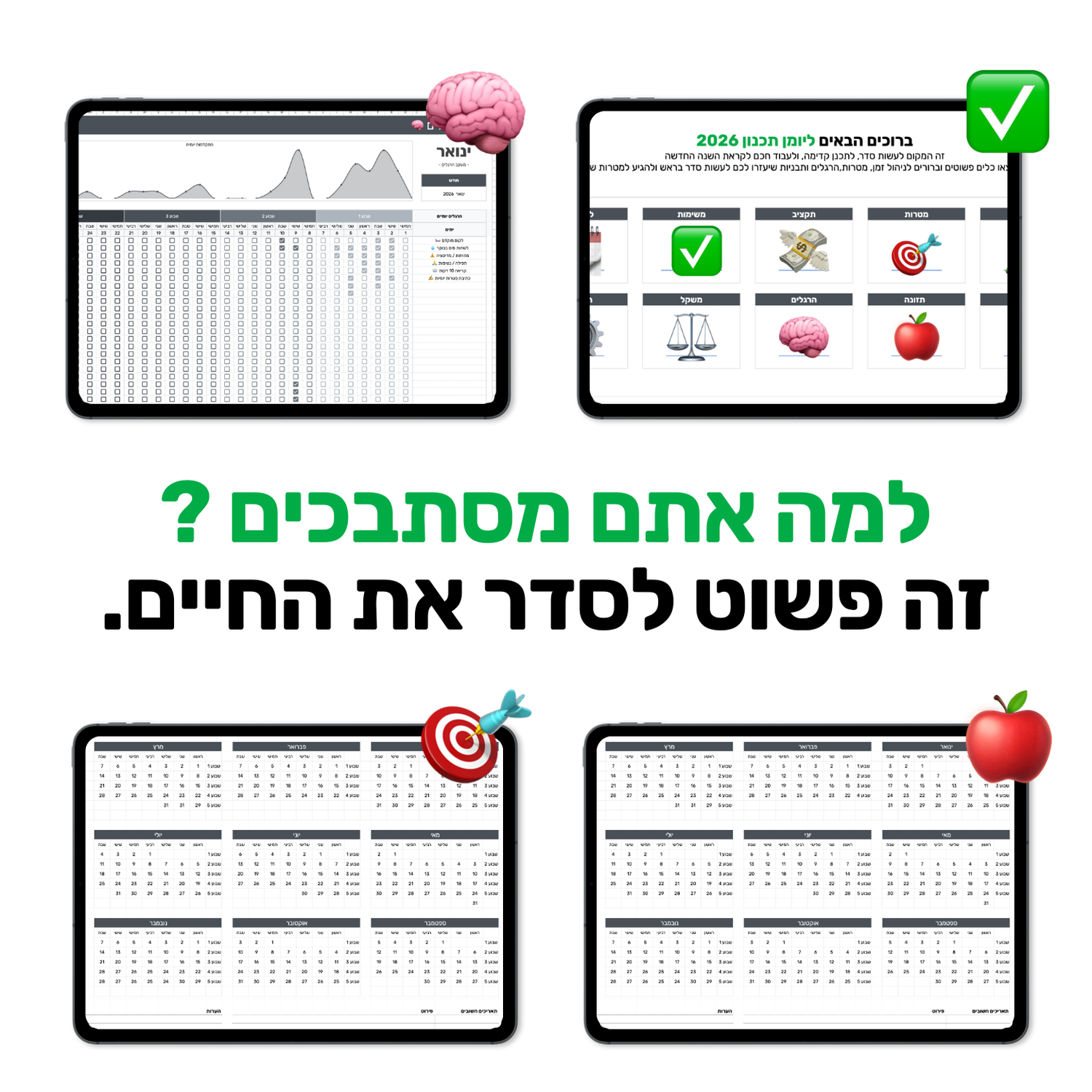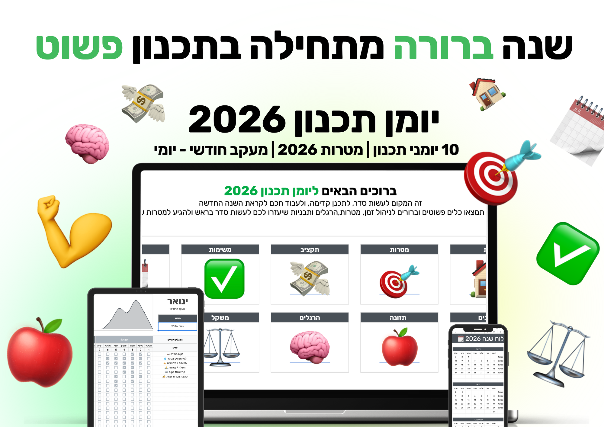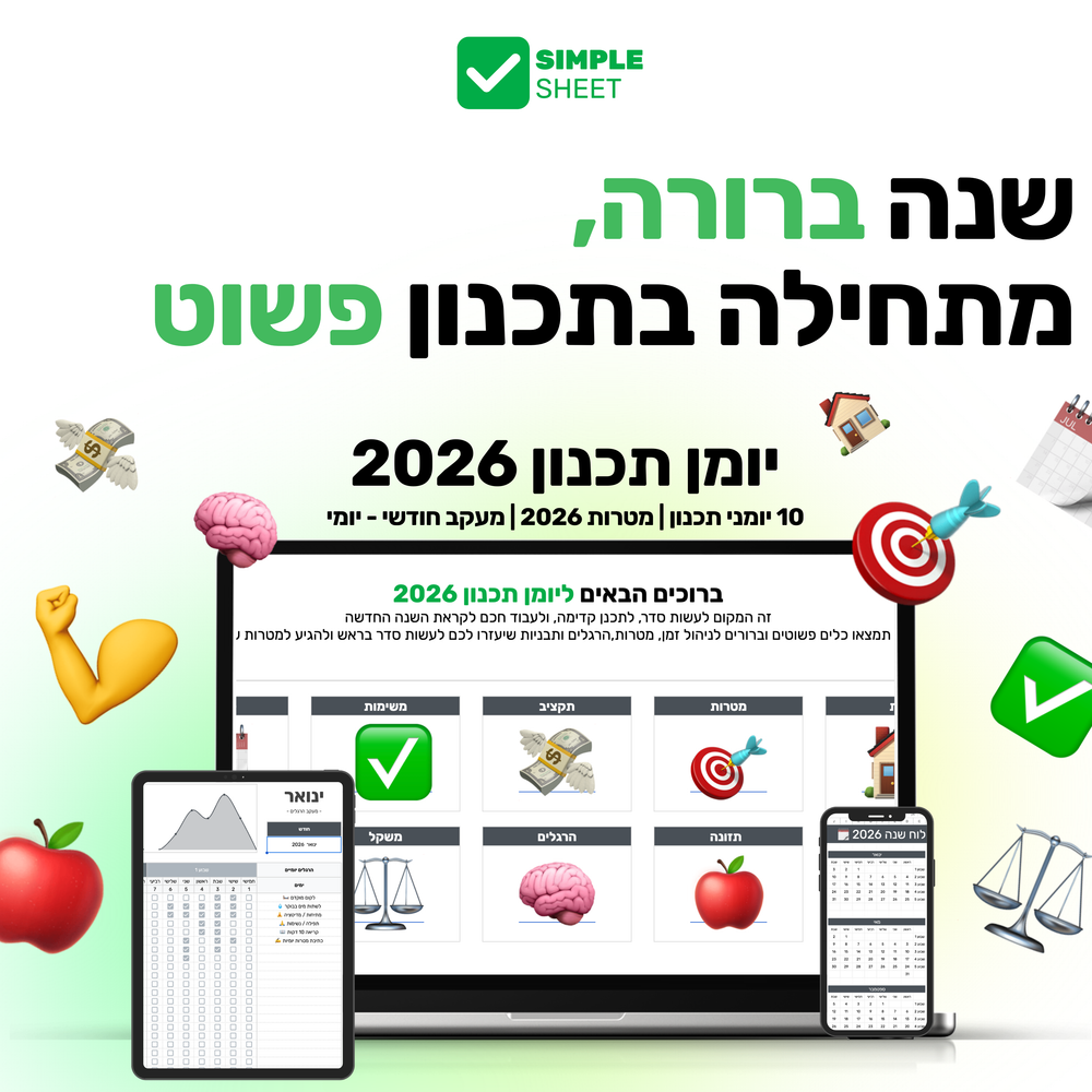 יומן תכנון דיגיטלי לשנת 2026, שנבנה כדי לעזור לך לראות את השנה בצורה ברורה — בלי עומס, בלי סיבוך ובלי רעש מיותר.היומן עובד כקובץ חכם ב-Google Sheets ומרכז במקום אחד תכנון שנתי, חודשי ויומי, בצורה פשוטה ונוחה לשימוש.